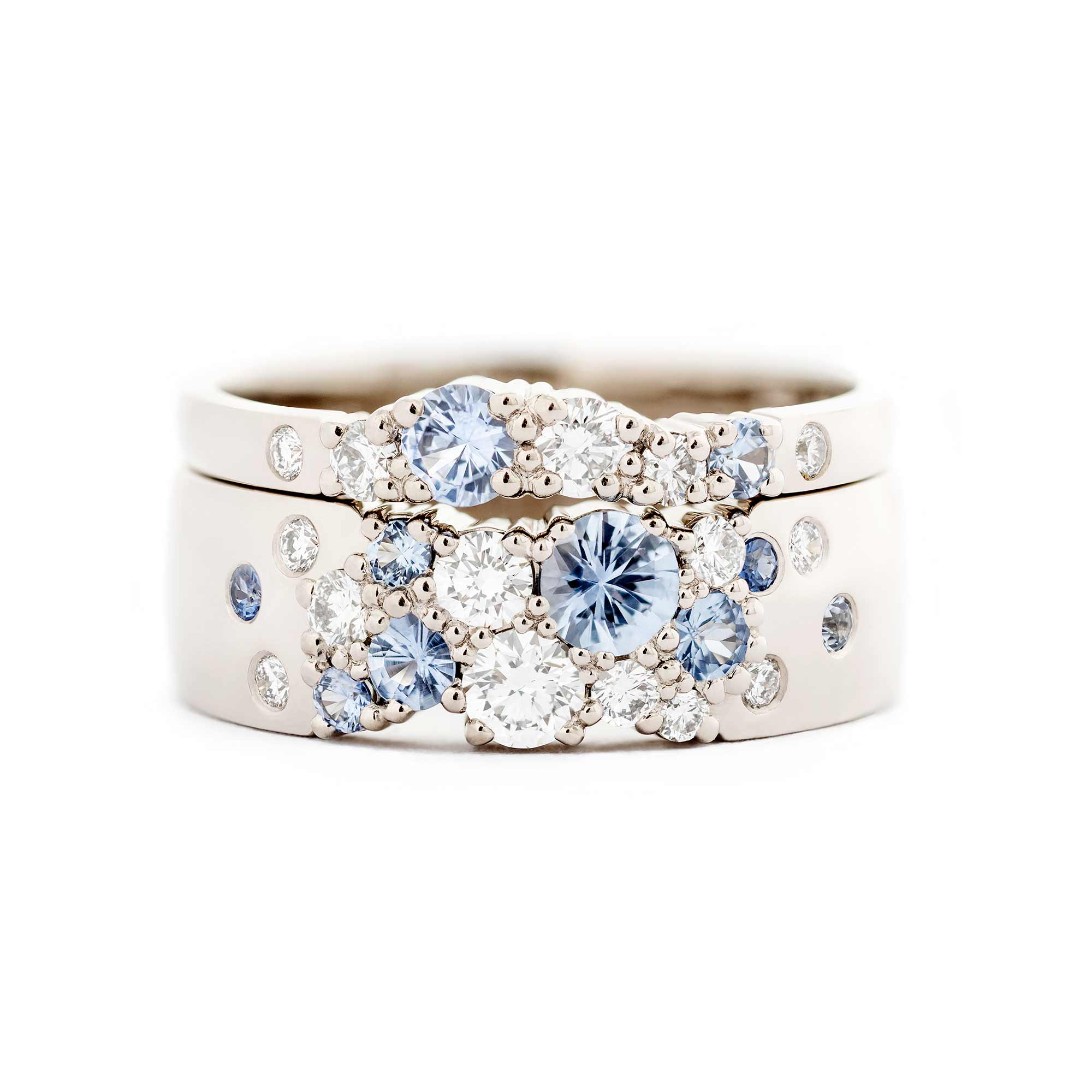 Keto Meadow 6mm Spring Blue is a lovely ring crafted in 18K gold or 950 platinum set with pastel blue sapphires and white diamonds. The asymmetrical placement of the gemstones creates a rich, floral expression inspired by Nordic nature. It is perfect as an engagement ring, wedding band, luxurious jewelry gift — or as a meaningful piece to celebrate yourself.