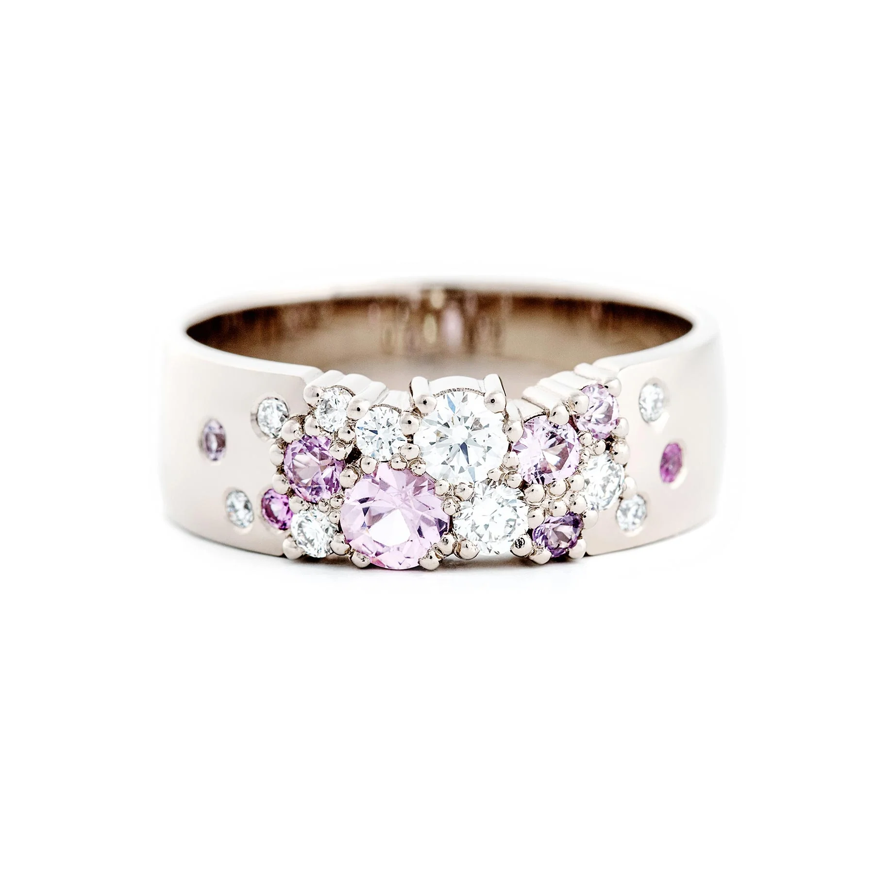 The Keto Meadow 6mm - Spring Pink ring has 10 white diamonds (total weight 0.28ct), quality TW/VS and 8 colorful sapphires (total weight 0.37ct).